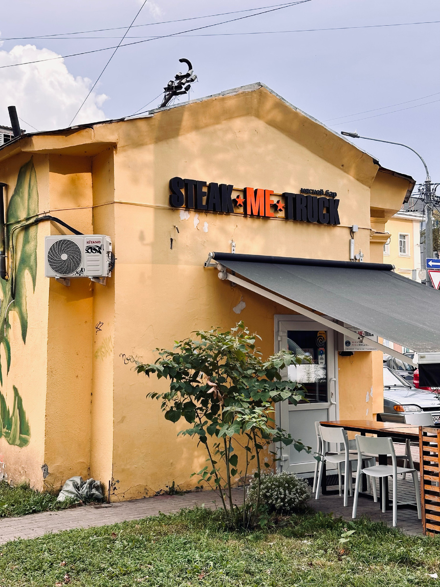Подпишитесь на мой канал в телеграме: обзоры новых и просто интересных мест в Москве и других городах. Пшшш… Передаю из Нижнего: в Steak Me Truck тартар из вырезки всё так же хорош. Пшшш. В Нижнем Новгороде есть удивительное место — Steak Me Truck, самый маленький стейк-хаус в мире. Это заведение действительно уникально, ведь оно находится в небольшом домике на краю сквера в центре города, где раньше продавали проездные на трамвай. Внутри заведения находятся всего три столика и небольшая стойка заказа/выдачи. Снаружи — крошечный летник с несколькими барными стульями. Меню на одном листе, но для такого крошечного места само меню — немаленькое. В нём и бургеры, и чизстейки, и тартары, и просто стейки, и салаты, и супы, и вкусный домашний пряный томатный сок. В этот раз я сюда снова за тартаром — и он очень хорош. Нарезанное воронежское мясо, слегка сбрызнутое маслом. Соли почти нет, но есть нарезанный маринованный халапеньо, который добавит нужную кислинку и остроту. Визит сюда — часть г