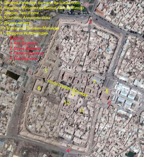 Ичан-Кала, старая часть Хивы, представляет собой почти правильный прямоугольник размером 750 на 420 метров с воротами на каждой стороне - это древняя планировка, которую когда-то имел едва ли не каждый крупный среднеазиатский город, по крайней мере та же Бухара. Но лишь в Хиве стены шахристана сохранились, и более того, их очертания остаются неизменными большую часть хивинской истории: ведь легенды называют её основателем Ноева сына Сима, построившего вокруг колодца Хейвак "город в форме корабля", и форма эта неплохо заметна на карте.