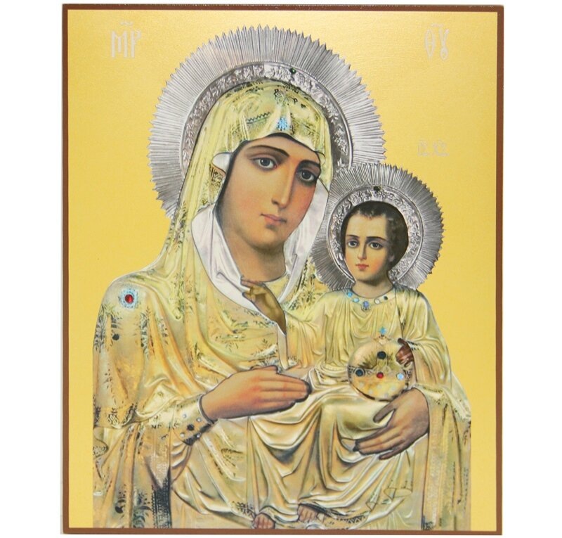 Эта икона написана святым евангелистом Лукой через 15 лет после Вознесения Господня. В 463 году греческий царь Лев Великий перенес образ в Константинополь. Там он пробыл почти 300 лет. По молитвам перед этой иконой Богородица помогла византийским войскам отразить нападение скифов. В 988 году эта икона была перенесена в Корсунь, её подарили святому князю Владимиру. Князь Владимир подарил этот образ новгородцам, когда те приняли христианство. В 1571 году царь Иоанн Грозный перенес "Иерусалимскую" икону в Успенский собор города Москвы. В 1812 году эта икона исчезла из собора. Предполагали, что во время войны её украли французские солдаты и увезли во Францию, в собор Парижской Богоматери. Но когда в 1977 году был сделан запрос, то главный инспектор по памятникам истории Франции ответил, что Иерусалимская икона в инвентаре собора не значится. В Успенском соборе разместили список этой чудотворной иконы, который находится там и сейчас. Так же списки с этой иконы есть в очень многих российски