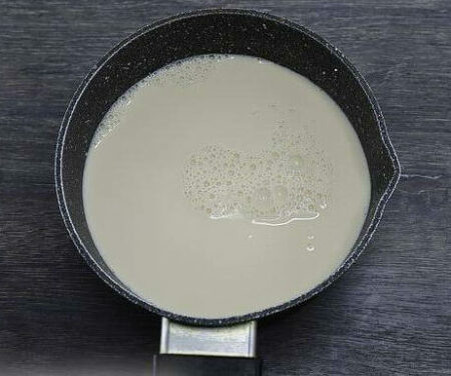 - Молоко я всегда разбавляю водой. Наливаю в сотейник 100 мл воды и 300 мл молока. Насыпаю сахар, соль, включаю огонь и довожу до кипения, при помешивании.