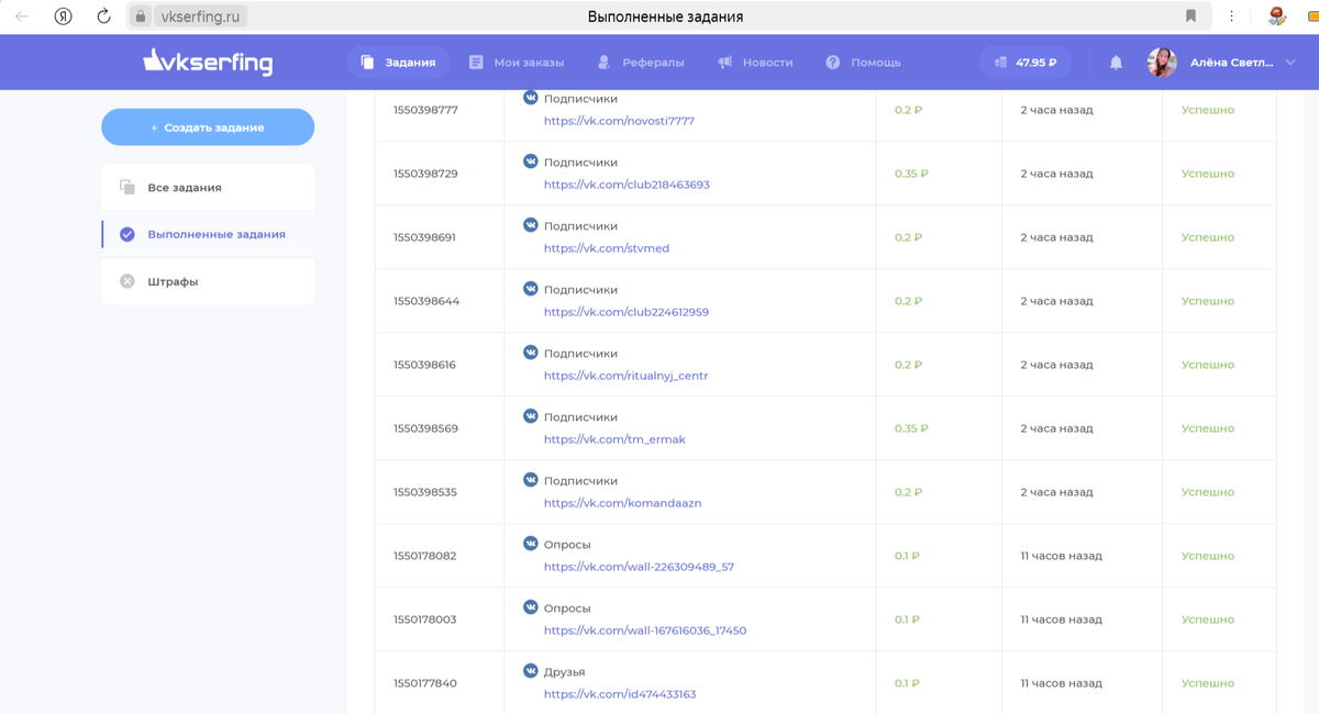 Друзья, сегодня хотела рассказать вам о платформе по заработку в интернете без вложений VK serfing. Регистрируетесь в сервисе , выполняете простые задания. Что мне нравится в этой платформе больше всего: При помощи своего аккаунта в контакте вы можете выполнить следующие задания: Также можно подключить Тик Ток, Telegram, Likee и другие соцсети. Заданий много, для заработка 100 рублей в день достаточно раз в 20 минут заходить на биржу и выполнять микро-задачи. Важно! При подписке на сообщества или аккаунты других пользователей нельзя отписываться ранее 30 дней, за такое нарушение возможен штраф. Деньги выводятся еженедельно по субботам. Я вывожу на свой аккаунт в Payeer, но можно также вывести на Perfect Money. На банковские карты тоже возможен вывод, но от 5000 рублей. А какие способы заработка знаете вы? Делитесь , буду рада вашим комментариям. Моим подписчикам дополнительный бонус, гайд как вывести деньги с Payeer на банковскую карту за пару кликов. Пишите комментарии, скину.