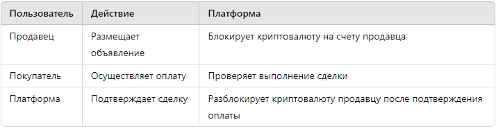 - Платформа блокирует криптовалюту на счету продавца до тех пор, пока не подтвердится получение оплаты.