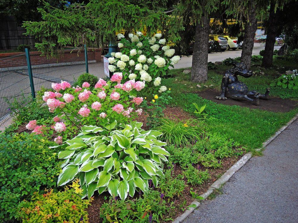 Вторая часть небольшой фотосессии, которую я устроил на территории около ресторанного комплекса «Сказка» в посёлке Управленческий, город Самара, во время прогулки в середине августа. Конец лета - время цветения гортензий. Именно эти цветы составили основу композиции одной из клумб. Среди них скромно спрятался маленький розовый куст. И совсем нескромно - один из персонажей, живущих на территории. Гортензиями оформлена и дорожка вдоль кафе. Подборка с фотографиями цветов и растений. Там же можно посмотреть первую часть этой прогулки.