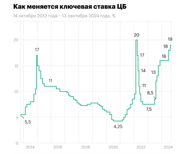 ЦБ повысил ключевую ставку до 19%: в чём причина и что будет дальше. Годовая инфляция по итогам 2024 года, вероятно, превысит июльский прогнозный диапазон 6,5–7,0%. Рост внутреннего спроса все еще значительно опережает возможности расширения предложения товаров и услуг. Требуется дополнительное ужесточение денежно-кредитной политики, для того чтобы возобновить процесс дезинфляции, снизить инфляционные ожидания и обеспечить возвращение инфляции в 2025 году.
