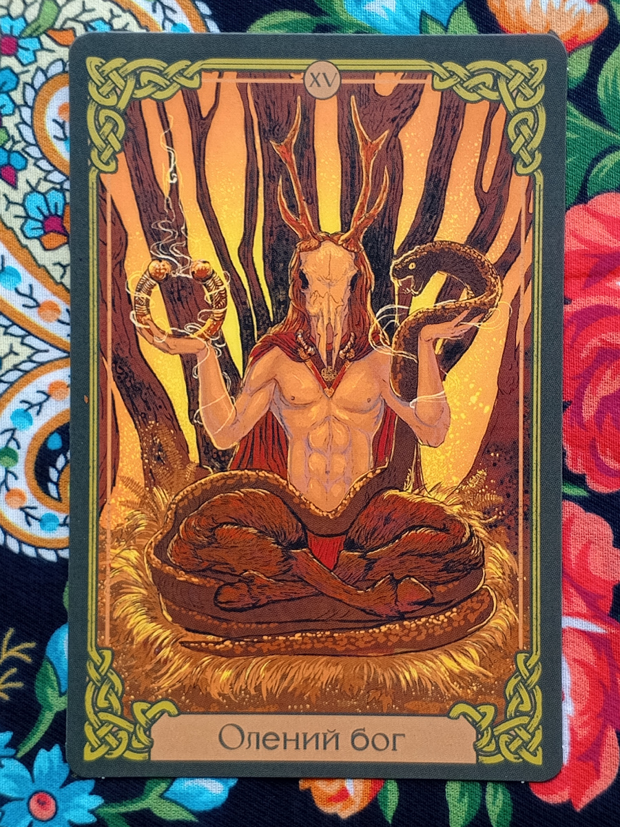 Здравствуйте, уважаемые читатели. В этом выпуске мы разберём значение ещё одной карты, чтобы понять основные характеристики этого воскресенья - 15 сентября. В глубине древнего леса, наполненного шепотом вековых деревьев и магией, скрытой от глаз посторонних, обитает Олений Бог. В своём гнезде из густой травы и мха он предстает как воплощение природы, её силы и непредсказуемости. Его оленьи ноги, символизируют связь с землёй и её ритмами, а рогатый череп вместо головы напоминает о цикличности жизни и смерти, о непрерывном круговороте энергий в природе. В одной из его рук — ядовитая змея, олицетворяющая опасности и трансформации, которые неизбежны в нашем пути. Змея извивается, готовая укусить, предупреждая о том, что жизнь полна испытаний, и иногда нужно быть готовым к неожиданным переменам и преодолению собственных страхов. Но она также символизирует мудрость и способность обновляться, сбрасывая старую кожу и освобождаясь от того, что больше нам не служит. В другой руке Олений Бо