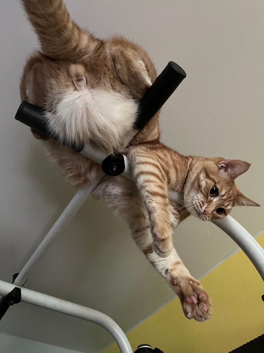 - С первого дня рыжий почувствовал себя в квартире хозяином. Целый световой день кот сидел на подоконнике и наблюдал за голубями, которые периодически садились на плинтус окна. Голуби поворачивались к коту и весь их вид говорил.... -Попробуй, поймай рыжая морда.... Кот начинал нервничать и колотить лапой по стеклу. Голуби отворачивались и не обращали на взбесившегося кота внимание.... Вдоволь наколотившись лапами по стеклу, кот шёл к миске. Наевшись, рыжий залезал на шведскую стенку и начинал заниматься физкультурой. Он подтягивался несколько раз, потом переворачивался и висел вниз головой, пугая хозяев. Кота уговаривали слезть , но рыжий уговорам не поддавался . Он занимался кошачьей физкультурой ежедневно. Спать ложился исключительно на кухонный стол и как его не наказывали, он продолжал спать на столе. Боялся кот только шнура от телефона и как только он видел, что брали шнур несся спасаться. Кот по своему возрасту и неопытности иногда не мог рассчитать габариты, и врезался головой в стену ,рядом с проёмом двери.