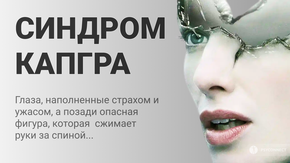 Глаза, наполненные страхом и ужасом, а позади опасная фигура, которая угрожающе сжимает когтистые руки за спиной нашего героя. На лице этой фигуры маска с надписью “мама”. Пациент с синдром Капгра чувствует себя “ребенком” в угрожающей ситуации, где его родные и близких вдруг исчезают, и их заменяет двойник в маске. Она похоже на его маму, но это вовсе не она! И к тому же она опасна, а поэтому необходимо как-то от нее защищаться. Именно, на таком восприятии действительности построено поведение больного с синдром Капгра. Синдрома Капгра проявляется в том, что у человека изменяется восприятие окружающих его людей, отдельных предметов или обстановки. Это феноменологически неоднородное расстройство, которое включает иллюзии, бред, галлюцинации, психический автоматизм. В зависимости от преобладания одного или другого симптома различают несколько типов синдрома Капгра. Наиболее известными в этой классификации является бредовые формы ложных узнаваний — бред двойников. Сюда относятся симптом,