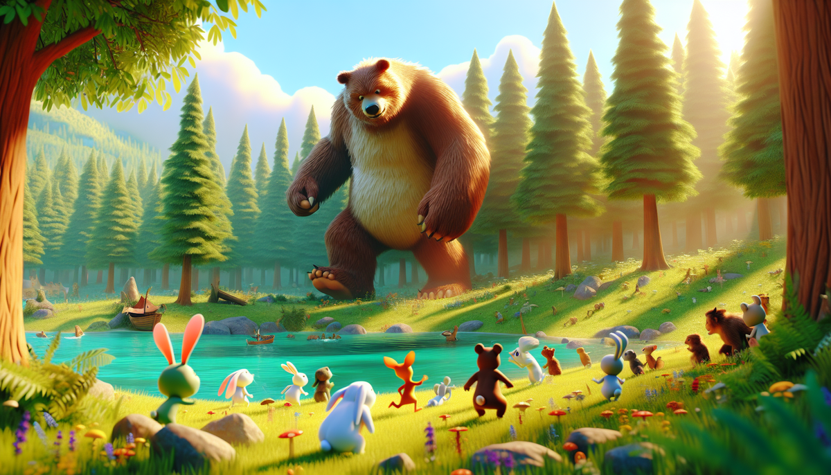 В одном светлом лесу жил маленький медвежонок по имени Топтыжка. Он был храбрым и добрым, и все звери его очень любили. Однажды, когда Топтыжка играл у озера, к нему подбежал зайчонок и, запыхавшись, сказал: — Топтыжка, Топтыжка! Помоги нам! Лесной великан совсем разгневан и пугает всех! Топтыжка мгновенно решил помочь своим друзьям. — Не волнуйся, зайчонок, — сказал он. — Я пойду к великану и поговорю с ним! Собравшись, Топтыжка отправился вглубь леса. Он знал, что великан живет в большой пещере на горе. По пути встречал других животных, и все они спрашивали: — Куда ты идешь, Топтыжка? — Я иду к лесному великану! — отвечал медвежонок. — Надо поговорить с ним и остановить его гнев! Когда Топтыжка добрался до пещеры, он увидел, как великан сердито топает на своем месте. Земля дрожала от его шагов. Медвежонок без страха подошел ближе и сказал: — Привет, добрый великан! Зачем ты пугаешь всех животных в лесу? Великан поднял голову и увидел маленького медвежонка. — Я не знаю! — огорченно ск