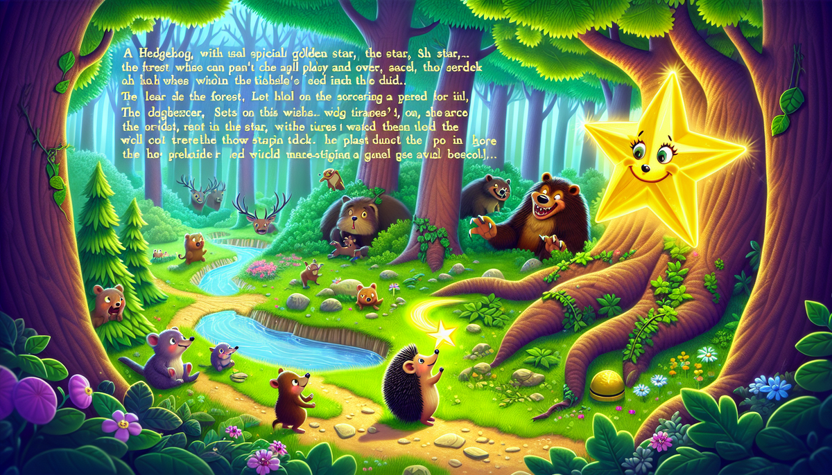 В глубоком, зелёном лесу жил маленький ёжик по имени Ежик. На его спинке была особенная звезда — золотая, сияющая, как солнечный лучик. Эта звезда могла исполнять желания и даровать силы, но только если Ежик использовал её во благо. Однажды в лес пришёл злой чародей. Он хотел завладеть всем лесом и сделать его своим. Чародей заколдовал деревья и цветы, и они стали печальными. Животные не могли играть и смеяться, им было страшно, ведь чародей мог обернуться в любое существо и пугать их. Все звери собрались под великой дубовой деревом. — Ежик, у тебя есть волшебная звезда! — сказала мышка Маша. — Ты должен что-то сделать, чтобы спасти наш лес! Ежик задумался. — Я попробую, — ответил он, полон решимости. — Надо найти чародея и остановить его. Скоро Ежик отправился в путь. Он пробирался через густые кусты, пересекал маленькие речки и стремился к логову злого чародея. Вдруг он увидел, как чародей колдует над большим деревом, заставляя его терять листья. — Прекрати! — закричал Ежик, стараясь
