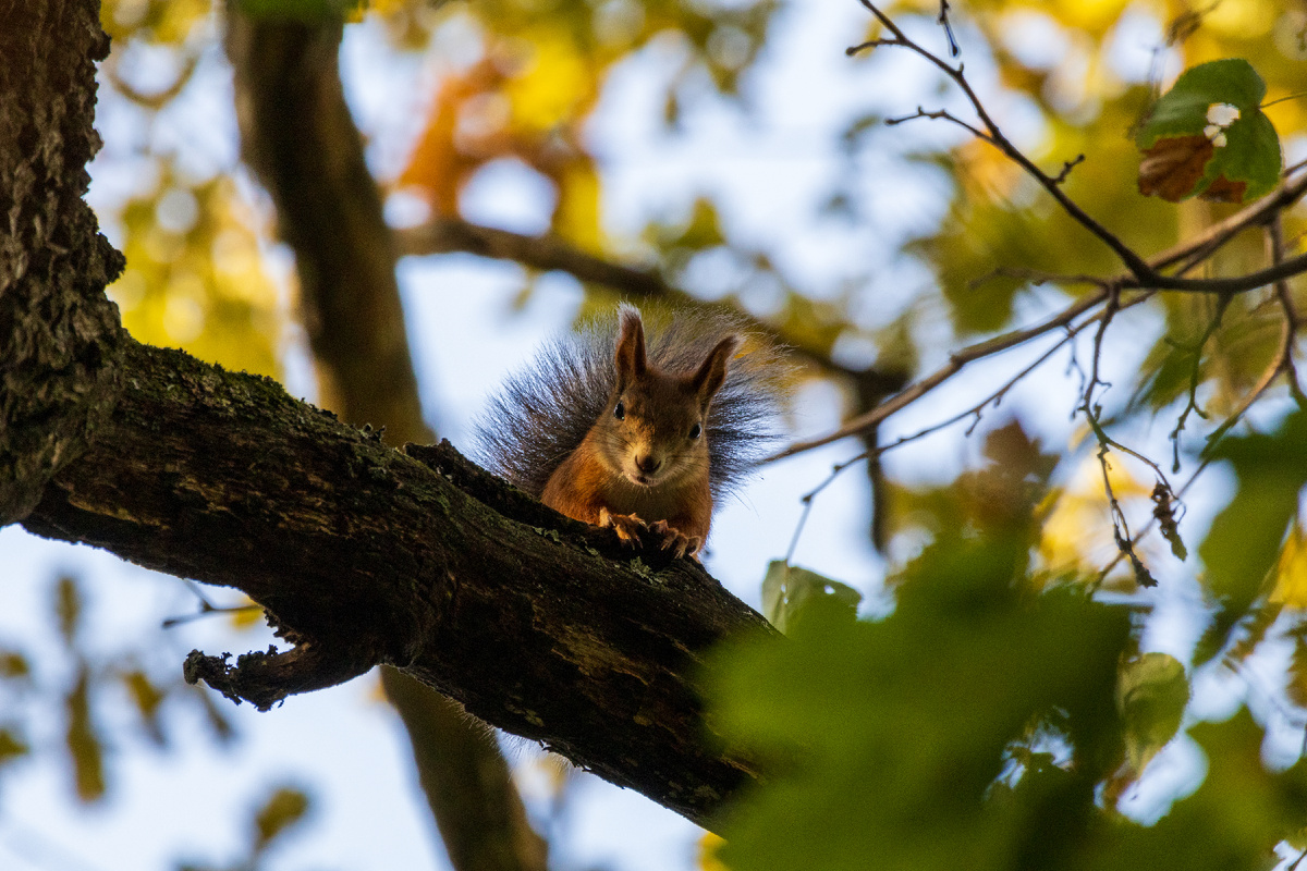 Хоть осень и раскрашивает леса в свои краски, дубы держат сопротивление, чего не сказать про лесные орехи, которые полностью стали ярко желтыми и почти полностью сбросили листья. Листвы все еще много, все так же еще довольно темно для фотографий внутри леса. Жду с нетерпением когда же посветлеет. Еще заметил, что птицы до 9 обычно поют где-то на макушках деревьев, наслаждаясь солнечными лучами. Ниже они перемещаются уже позднее, так что видимо пора начинать прогулки немного позднее. Все больше встречаются белки, которые все бегают с места на место, то что-то закапывая, то наоборот откапывая. За сегодня встречался с белками 4 раза (не уверен, что в четвертый раз это была не какая-либо белка из прошлых встреч, так как с ней встретился уже на обратном пути, хотя шел совсем другим тропами). Первую смог заметить лишь по шуму падающих шишек, что она там с ними делала не известно, но падали они прям с довольно высокой частотой на хрустящую подушку из листьев и иголок. Вторую обнаружил тоже