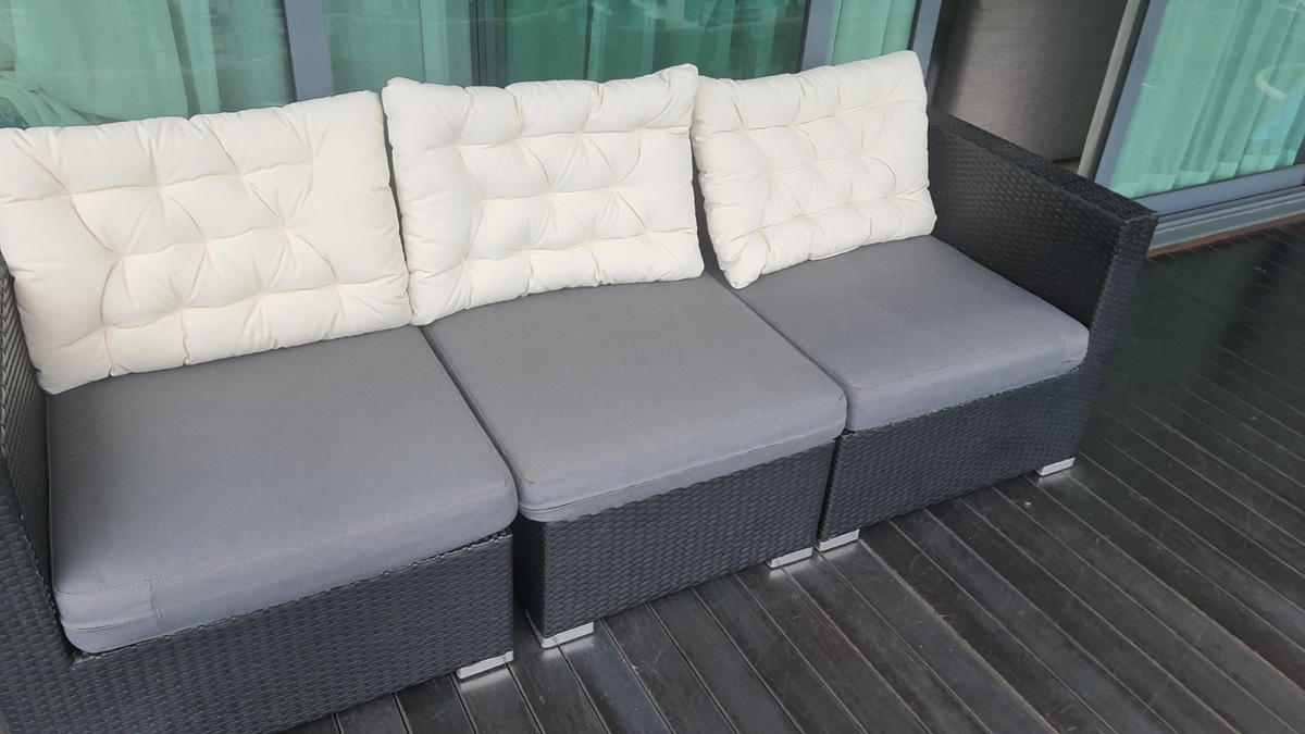 Всем доброе утро (добрый день)! После долгого перерыва (дочь с семьей в отпуск прилетала, дача, заготовки.....) сделала нужные вещи для дочери. Причем использовала как старые вещи (серые джинсы, светлую рубашку, детский полосатый свитерок, черную трикотажную юбку, так и новое трикотажное полосатое платье, купленное на распродаже за смешную цену. Решила сделать декоративные наволочки на подушки к дивану на лоджии у дочери, тем более через неделю улетаю к ним в гости. Так как у них тепло круглый год, то и пользоваться можно все время, а не убирать на зиму, как у нас в Сибири. Вот так выглядит диван с новыми подушками белого цвета. Конечно, это не практично, вот мне и захотелось использовать еще нормальные вещи, подарить им вторую жизнь. Я всегда, когда раздаю ношенные вещи, оставляю себе то, что может пригодиться для переделки. В данном случае подбирала ткани в серо-черной гамме с добавлением молочного цвета. А вот вещи, которые я использовала для работы, правда не все фото сделала. Но
