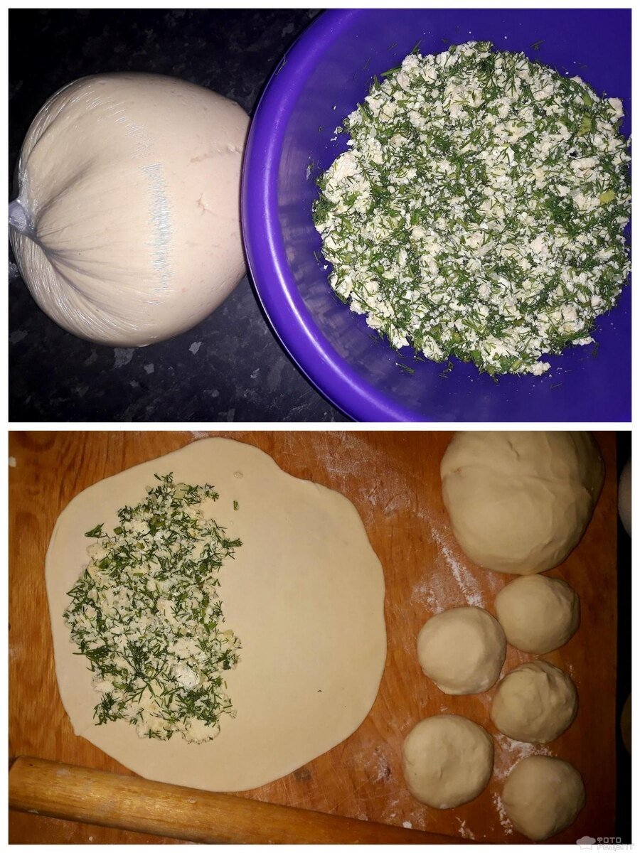 Ингредиенты: молочная сыворотка - 1 шт; мука - 900гр; соль - 1 ч.л; сода пищевая - 1 ч.л; масло сливочное - 100 гр; творог - 600 гр; зелень петрушки - 400гр; масло сливочное - 50 гр; лук репчатый - 1 шт; яйца куриные - 1 шт; масло подсолнечное - 50 гр Тесто: ● Сыворотка -0.5 л ● Мука - 900 г (примерно) ● Сода -1 ч. л ● Соль -1 ч. л ● Масло сл(спред) -50-100г Начинка: ● Творог -500-600г ● Зелень -большой пучок ● Масло сл. -50г ● Лук -1 шт. ● Яйцо -1 шт ● И 50 г масла для смазывания Мой рецепт отличается от оригинала, так как тесто я делала на сыворотке с добавлением кусочка растопленного сл. масла. А творог делала сама из кефира, сыворотка осталась. Для теста - растворила в теплой сыворотке соль и соду, затем масло и добавляя муку, замесила плотное эластичное тесто. Месила минут 10. Положила в пакет и оставила на час. Перед приготовлением помесила недолго ещё раз. Для начинки - пассировала очень мелко нарезанный лук в сл. масле на слабом огне. Творог у меня получился сухов