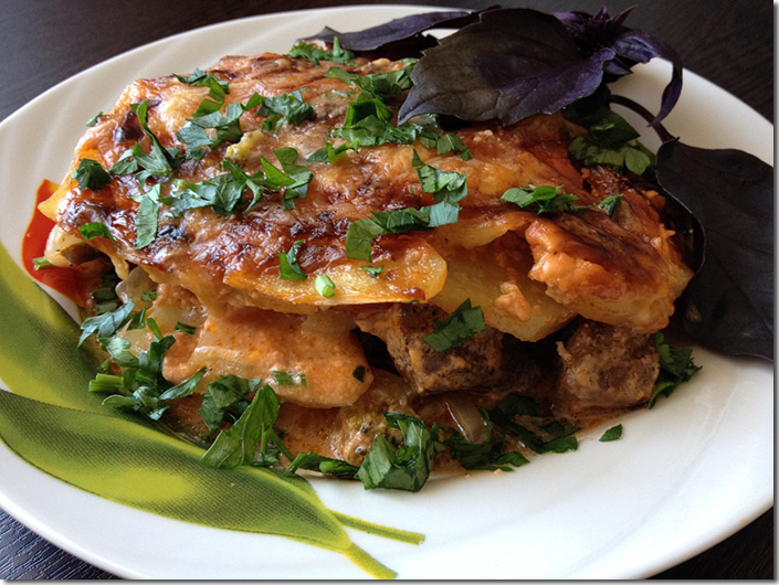 Все ингредиенты выкладываются слоями в форму для запекания, смазанную растительном маслом.