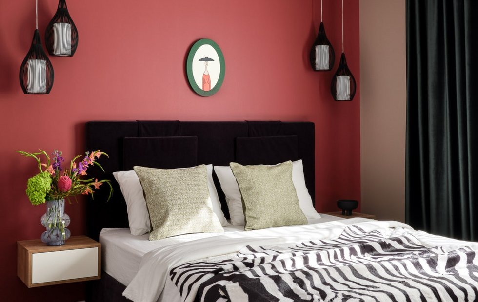Спальня получилась очень контрастной: активный цвет марсала (красный) с черным изголовьем кровати задают романтичное настроение. Большой объем цвета присутствует в изумрудных шторах.