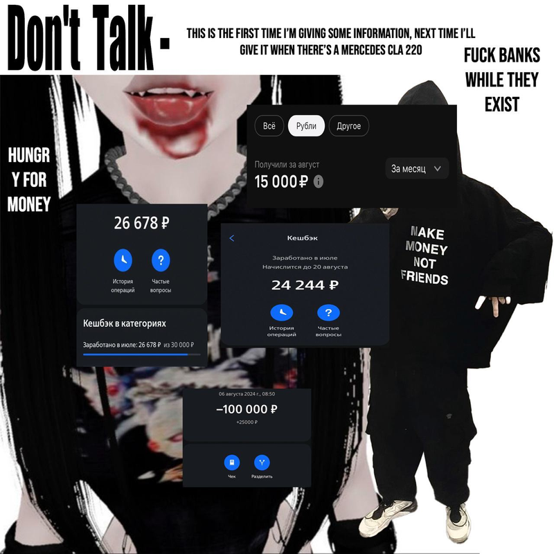 Всем привет, на тексте Don't Talk. Уже добрался до кризиса четверти жизни, так что поймете сколько мне примерно лет Я родился вообще в небольшом тусклом городе, от куда стараются уехать те у кого ещё хоть немного горят глаза, я был одним из тех кто уехал сразу как стукнуло 18 лет Приехал в чужой город миллионник буквально с 3к на карте, в квартиру где не вывезло бы жить большинства даже за бесплатно, в дом котором квартиры горят по кд от торчков, после которой буквально конец города и тупо лес Всегда в глазах была искра, хоть взгляд был совсем и не такой, надо было вывозить Жрал бутерброды с контейнера чтобы не тратить бабки пока ищу работу, часто ездил с конца города по 10-15 км ежедневно чтобы найти место где нужен был бы сотрудник. Вспоминаю и ахуеваю если честно Но сердце всегда принуждало и жаждало большего, истинная цель не такая которую я уже имел, и до сих пор не достигнута, это вечная гонка Десятки способов заработка/схемы/скилзы - путь который все должны пройти пока стезя н
