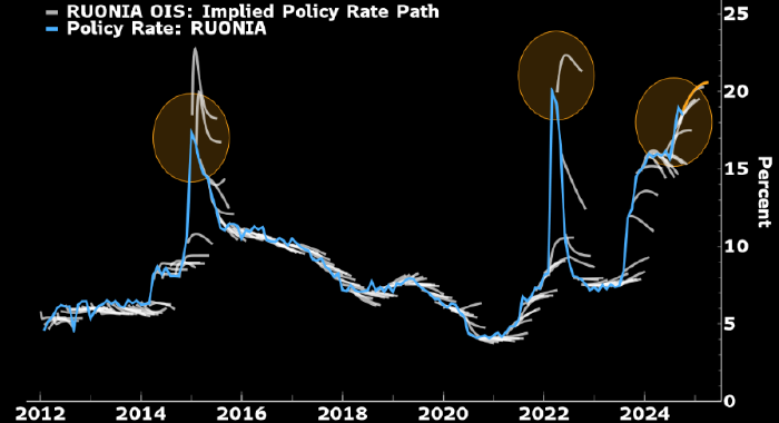 Bloomberg: ключевая ставка, вероятно, достигнет пика в IV кв. на уровне 20–22%