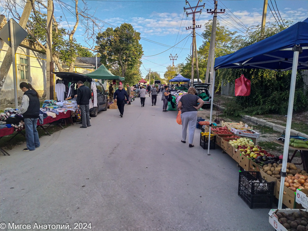 В 7.40 мы на рынке. Торговля вовсю идёт. В последнюю неделю в Старом Крыму похолодало, так что не удивляемся, увидев народ в куртках. Впрочем, тепло ещё вернётся, поэтому я всё ещё хожу в шортах и футболке, только иногда надеваю лёгкую джинсовую куртку. Арбузов на рынке всё ещё много. Можно найти арбузы по 15-20 рублей за килограмм, но самые крупные стоят 25 руб. А вот дынь сегодня на рынке совсем мало. Цена 70 руб/кг. Появился дайкон, цена 50 руб/кг. А также редька по 70 рублей. Это редька совсем не горчит, в отличие от чёрной. Называется арбузная, потому что сверху зелёная, а внутри красная. Хороша для салатов, зимой мы её часто берём. Цветная капуста по 80 рублей. Зимой у нас цена поднимается до 150-200 руб/кг. Отличные баклажаны по 50-60 руб/кг. Можно найти и по 30, но они будут не так хороши. Баклажаны я беру для китайской лапши. Раньше Лена готовила её с болгарским перцем и кабачками, а в этом году кабачки заменила на баклажаны, мне так больше нравится. Приличные помидоры сег