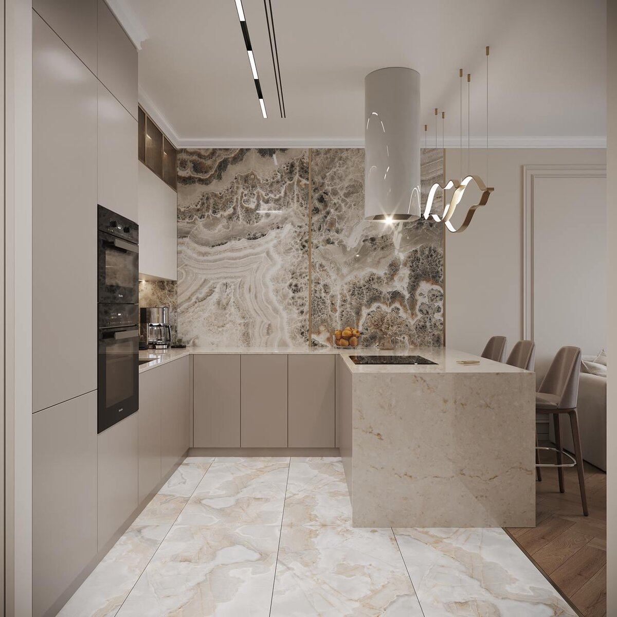 "Дизайн квартиры премиум класса в стиле Ар-Деко отличается благородными материалами, элегантными формами и яркими акцентами, – рассказывает Евгения Бубенщикова. – Кухня в таком интерьере становится настоящим произведением искусства с роскошной отделкой, дорогой фурнитурой и изящными светильниками".