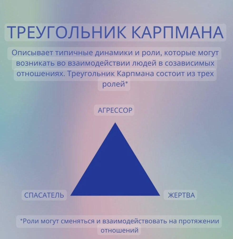 Мы так часто в последнее время говорим про треугольник Кармана, что пришло время слегка в нём разобраться. И что очень важно - ответить на вопрос - зачем за него так крепко держатся все участники (почему не хотят прекратить его существование)? Итак, внимание - ответ: этот бермудский, то есть "карпмановский" треугольник позволяет участникам ОТКЛАДЫВАТЬ решение действительно важных вопросов. Жертве позволяет не решать ничего, ибо НЕТ ни сил, ни желания к решению существенно важных жизненных вопросов. Спасателю позволяет не реализовываться через какую-то деятельность или не решать свои важные проблемы, а заниматься решением проблем Жертвы. Ну а что же Агрессор? Ему - то что нужно от этого треугольника? И ведь нужно - Агрессору треугольник позволяет избегать близости. Да - да, близости боится Агрессор, потому как в ней могут рассекретить его уязвимую сущность. И ведь у каждого же есть столько дел в своей роли в этом треугольнике! Отсюда становится понятно, почему энергии не хватает ни на ч
