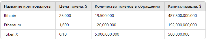 Если цена одного токена составляет $100, а в обращении находится 10 миллионов токенов, капитализация будет: