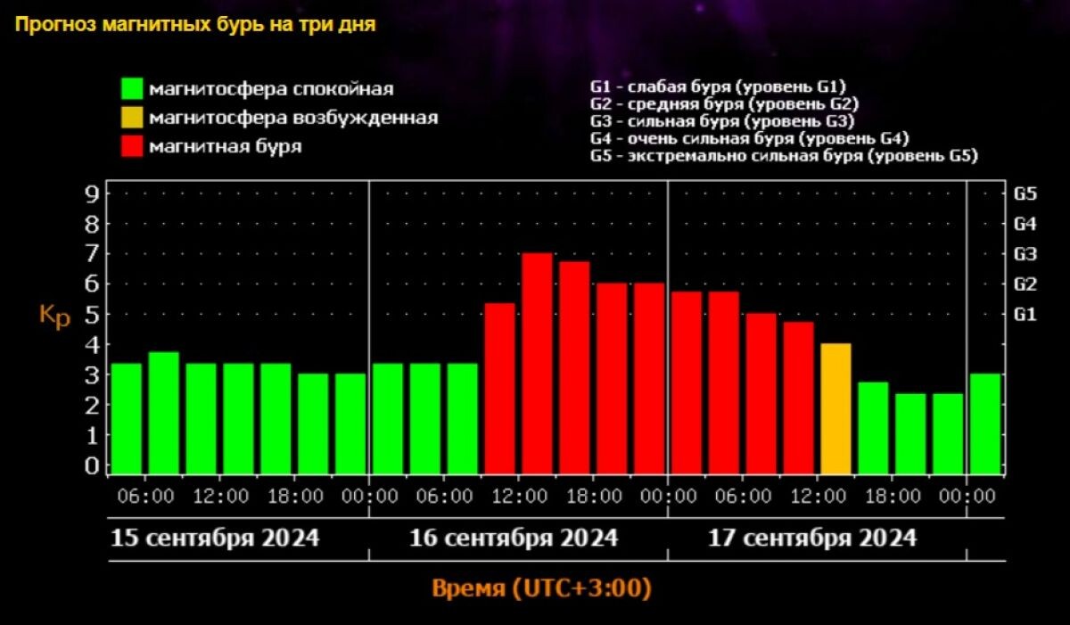 Сильная магнитная буря накроет регион в понедельник, 16 сентября. Волнения начнутся уже в 9:00 часов, а пик магнитной бури придется на период 12:00 часов до 18:00 часов 16 сентября. Показатели будут достигать уровня G3. Вечером понедельника колебания магнитосферы медленно пойдут на спад. В период с 18:00 часов 16 сентября до 6:00 часов 17 сентября в регионе ожидается средняя магнитная буря. Показатели будут близки к уровню G2. Колебания магнитосферы достигнут показателей нормы к 12:00 часам во вторник, 17 сентября. Однако все еще будут заметно возбуждение магнитного поля. Вероятность бури оценивают в 15-25%, шторма - 30-35%. Об этом сообщают данные лаборатории солнечной астрономии Института солнечно-земной физики Сибирского отделения РАН. Также слабую магнитную бурю прогнозируют 26 и 27 сентября. Показатели будут достигать уровня G1. 28 сентября буря пойдет на спад, однако будет заметно возбуждение магнитосферы.