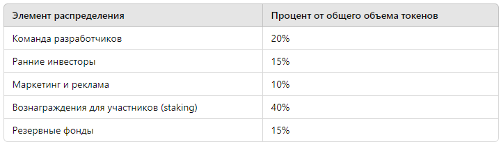 - Доли распределения — между разработчиками, командой, инвесторами и сообществом.