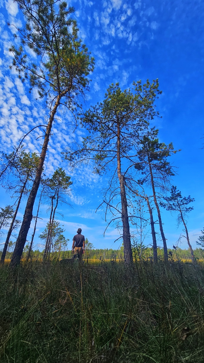 Какая же звенящая, глухая тишина на болоте в жаркий день! Багульник отпугивает комаров, нет птиц, нет диких животных - просто словно пустота. Удивительно. Мы взяли с собой умную овчарку, чтобы он предупредил нас, если диких зверей встретим, но даже собака была удивлена тишиной😄