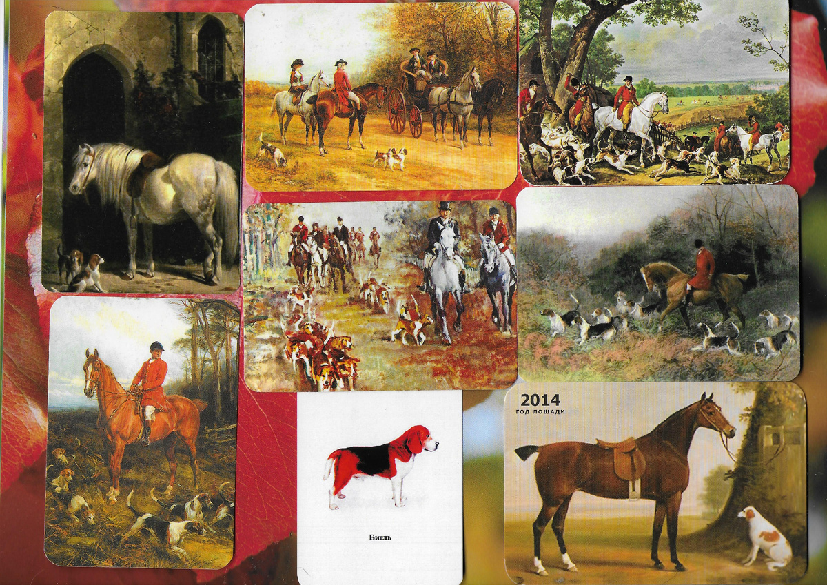 15 сентября отмечают день замечательной породы - бигль. Сопровождающие охотников бесстрашные голосистые, но в то же время совершенно безобидные в отношениях с человеком собаки. Поэтому они завсегдатаи съемочных площадок и благодаря этому имеют большую популярность в мире. Стоит вспомнить только фильм "Кошки против собак" и сразу кто встает перед глазами? Конечно же очаровательный Лу - бигль с суперспособностями. И есть еще масса, даже российских кинолент, с участием этих четвероногих питомцев. В Англии на рубеже 19 и 20 веков частенько художники изображали на своих полотнах охоту на лис и зайцев. Например Хейвуд Харди искусстно это делал. Не берусь с точностью сказать что на картинах именно бигли, скорее их более крупные гончие сородичи фоксхаунды, но я все равно покажу несколько календариков . Может кто-нибудь из специалистов прочитает мою статью и поправит меня. На скане есть и картины других художников, но к сожалению их названия и имена художников не указаны. Для ознакомления с пор