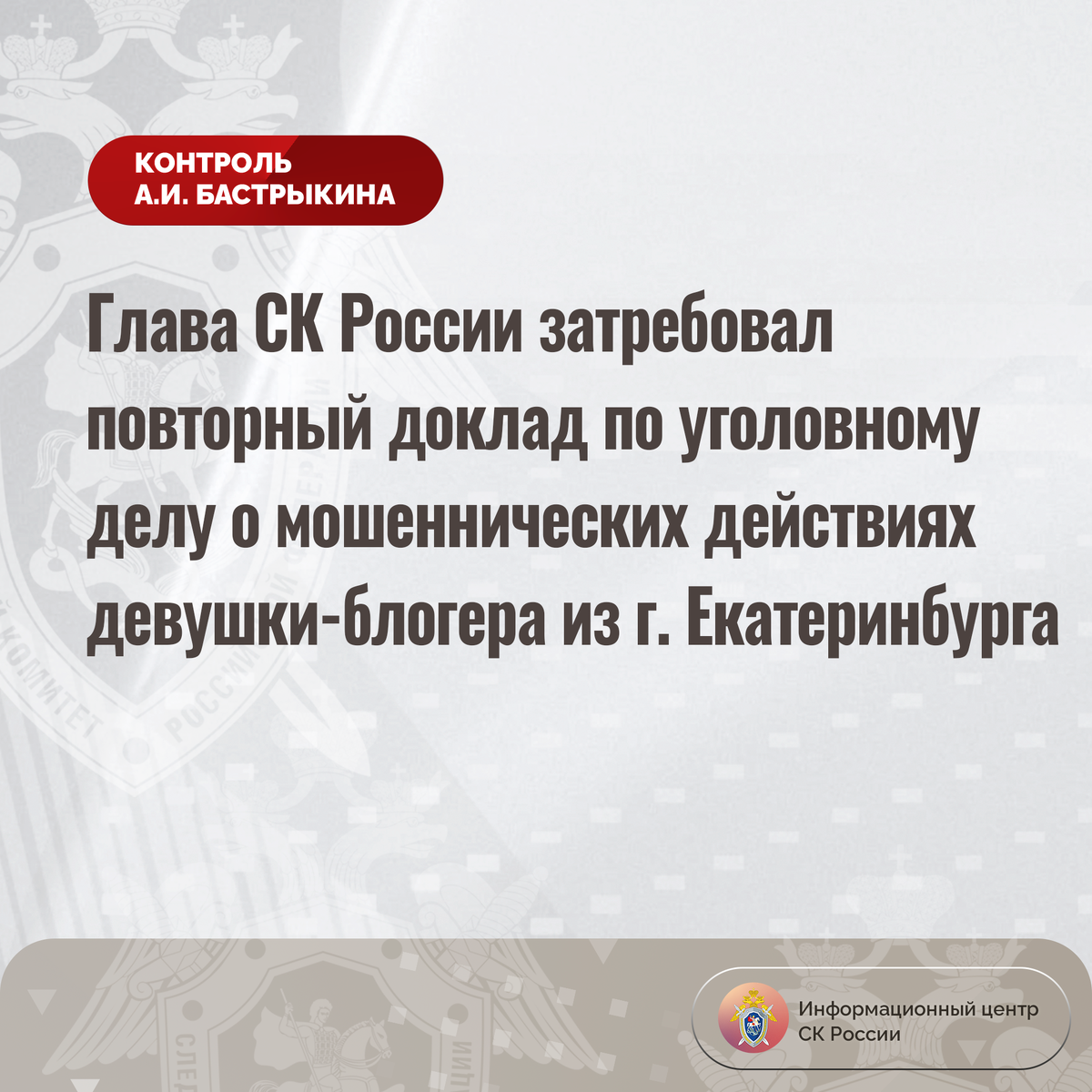 Глава СК России затребовал повторный доклад по уголовному делу о мошеннических действиях девушки-блогера из г. Екатеринбурга