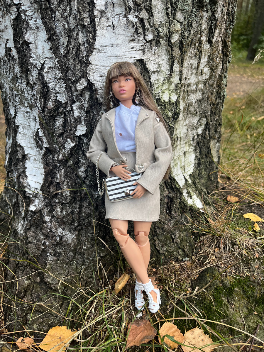 Привет! На днях Руи получила в подарок новый аутфит и решила его выгулять. Лето совсем не хочет покидать город на Неве, погода идеальна для прогулок. В комплект вошёл песочного цвета костюм, сумочка на цепочке, кошелёк, босоножки и серёжки. Готовый образ. В качестве первого слоя у нас нашлась только белая футболка-оверсайз. Она не очень хорошо помещается под куртку. Но что делать - пока что гардероб для пышек у меня небогатый. Сюда бы какую нибудь маечку беленькую. Мы с Руи отправились в парк. Конечно, золотая осень еще на наступила, но немного желтых листьев мы увидели. В который раз убеждаюсь в фотогеничности Руи. Девушка некапризная, особых условий не требует. Как считаете, идёт Руи обновка?
