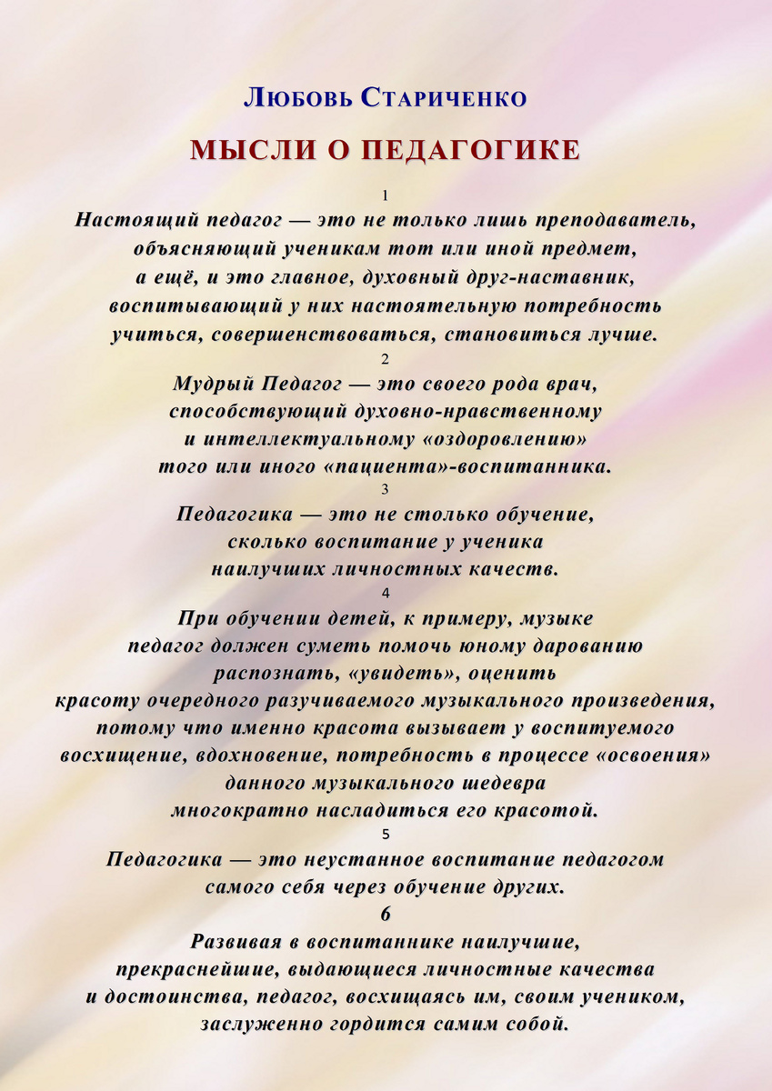 Дорогие друзья, многие из нас, кто является Духовным Наставником, Духовным Руководителем для себя, для своих близких, могут по праву считать себя педагогами. Я поздравляю вас с Днём учителя (в текущем году данный праздник отмечается в России 5 октября , 6 октября – в Беларуси), и в качестве творческого подарка вам ниже публикую мои «МЫСЛИ О ПЕДАГОГИКЕ». Буду рада познакомиться с вашими комментариями по этому поводу.