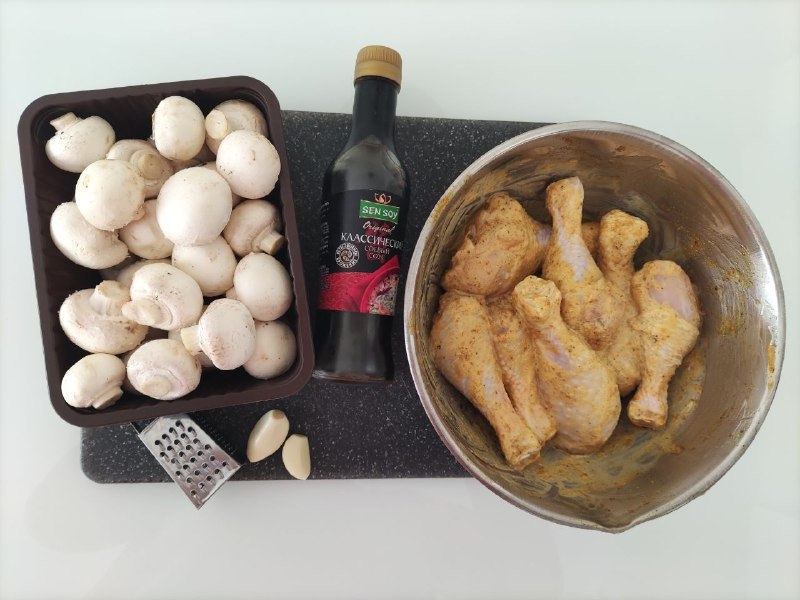 Майонез и растительное масло по столовой ложке Голень замариновать в специях и майонезе. Убрать в холодильник на час Шампиньоны помыть и почистить. Чеснок потереть на тёрке. В соевый соус добавить растительное масло и чеснок. Замариновать шампиньоны на полчаса. В остатки маринада окунуть голень и оставить еще минут на 30. Шампиньоны надеть на шпажки вместе куриными ножками выложить на фольгу. Запекать минут 40 при 180 градусов.