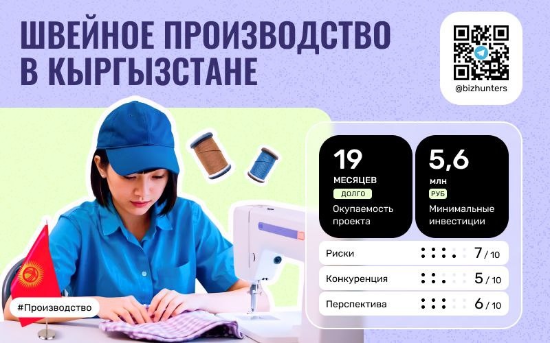 Запуск швейного производства в Кыргызстане под российские заказы. Высокий порог входа, но перспективы роста благодаря низким налогам и выгодной логистике. Суть бизнеса: запуск производства по пошиву одежды на заказ для российских заказчиков под маркетплейсы. Порог входа: высокий. Нужны деньги на строительство или ремонт цеха, швейное оборудование, найм персонала. Плюс опыт запуска бизнеса, навыки нетворкинга и связи на местах. Риски: ✕ мало заказов – с новыми производствами заказчики работают неохотно ✕ некачественная работа швей и закройщиков – большой % брака ударит по кошельку и репутации, налаживаем контроль качества ✕ незнание местных законов и особенностей – проблемы коммуникаций с персоналом и госорганами Перспективы: многие fashion-бренды из РФ отшиваются в Кыргызстане. Заказы в цехах распределены на несколько месяцев вперед и обороты растут. Страна входит в ЕАЭС (нет пошлин), есть налоговые льготы, ниже налоги, расходы на логистику и персонал. Окупаемость: ~ 19 месяцев Минима