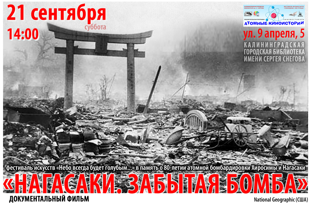 Автономная некоммерческая организация «Фестиваль музыки Битлз «Свободные, как птицы» (Калининград)» и Калининградская городская библиотека им. Снегова представляют просветительскую программу/кинофестиваль «Атомные киноистории» в рамках фестиваля искусств «Небо всегда будет голубым...» в память о 80-летии атомной бомбардировки самолётами армии США японских городов Хиросима и Нагасаки.