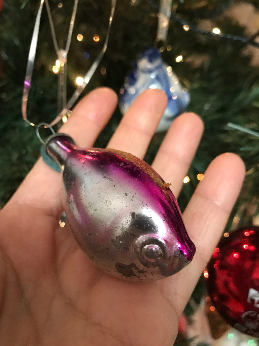 Перенесла из другой социальной сети прошлогоднюю заметку. *** Где-то между Новым, Старым Новым, Китайским Новым годом и тем более Тайским Сонгкраном дочь принесла коробочку, посылку с почты. В обычной с виду коробке рядком лежали мои детские воспоминания и чуть-чуть волшебства. Но это я потом поняла, а сначала увидела некие свёртки, которые с виду напоминали… я почему-то сразу поняла, что там советские ёлочные игрушки.. и тем волнительнее было разворачивать слои пупырчатой пленки, салфеток с новогодней тематикой.. В первом кулёчке была рыбка. Я никогда раньше такой не видела! У неё утеряны плавники, будем думать как приделать что-то. Зато сохранилась нитка!!! Моя дочь - рыбка по гороскопу и это, я думаю, будет её игрушка. Второй кулёчек выдал сосульку! На детской ёлке у нас висели разные, но такой - не было. В школьные годы они мне все казались некрасивыми, даже те, что с юбочкой из дождика. Оставляла их лежать в коробке. А тут переливы прозрачного и синего крашенного стекла, надо