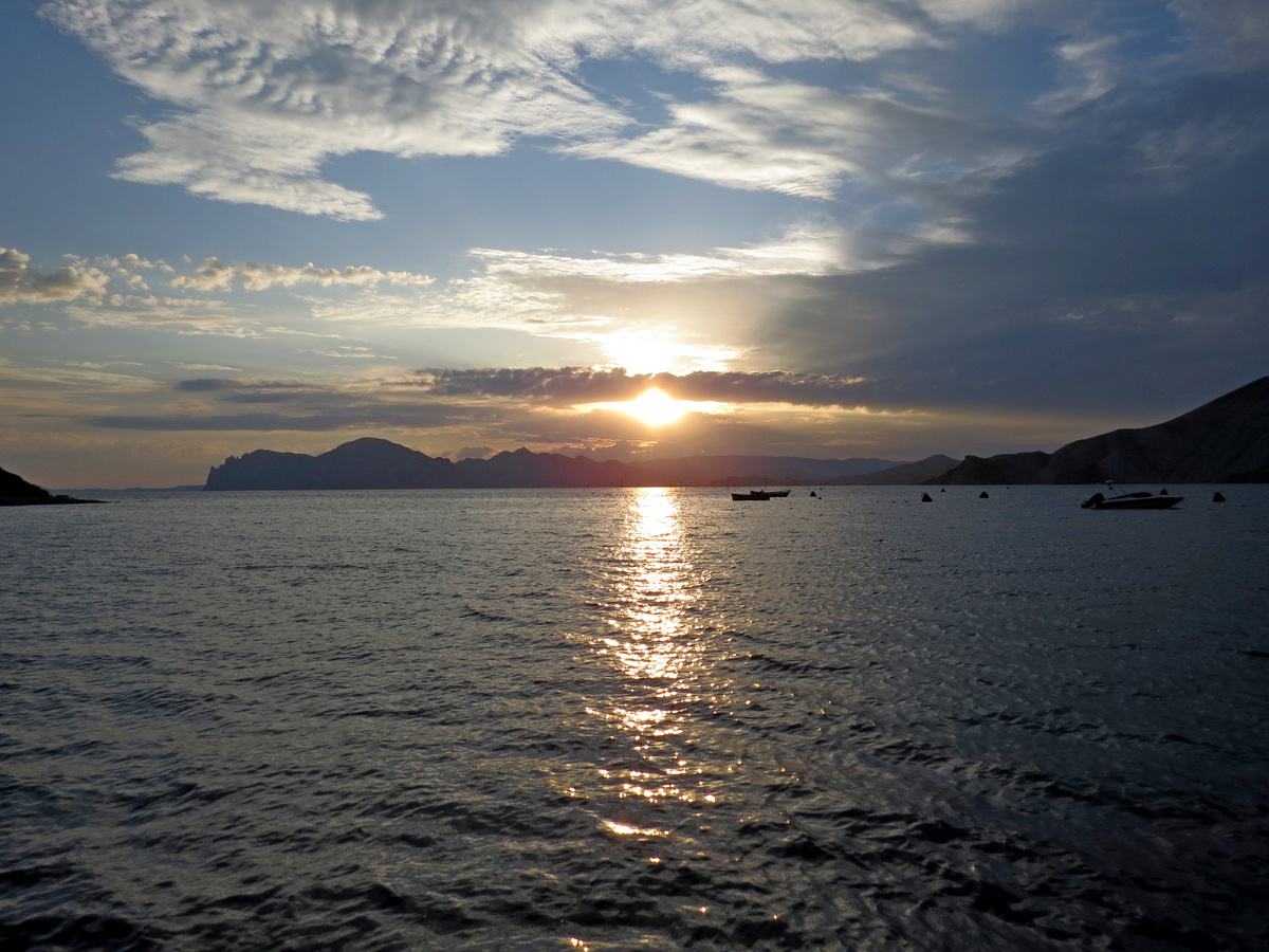 Да! Это первое, что пришло мне в голову, когда я увидела расходящиеся в разные стороны лучи закатного солнца. Мы уже давно не ездили вечером на море. За лето накупались. Так случается, если ты живешь рядом с морем. Но, в этот вечер, когда Миша вернулся с работы, мы поехали в свое любимое Орджоникидзе. Уже сентябрь и день стал значительно короче. Особенно это видно по вечерам. Когда мы искупались, солнце выглянуло из-за закрывавших его облаков и собралось прятаться за следующую гряду. Закат всегда загадочен. И никогда не знаешь, что будет дальше! Мы удобно расположились на камнях, налили чай и наслаждались вечерним морем, криками чаек и неполной луной, так ярко выделившейся на небосводе. Взгляд бежит по знакомым очертаниям гор. Меганом, Кара-Даг….. Ой, что это? Солнце из-за горы пустило свои лучи вверх! Еще минута и их стало уже больше! Хризантема! Мелькнуло у меня в голове. Хризантема расцветает! Невероятное чудо! После заката, уже ни что не надеешься. Не надеешься увидеть цветно