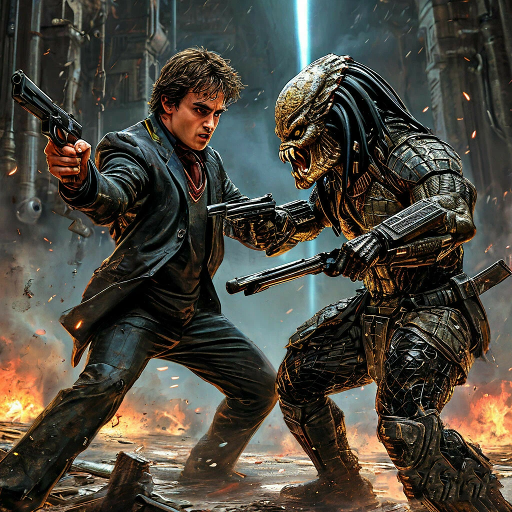 Битва началась. Магические вспышки заклинаний Гарри и его армии разрывали воздух, сталкиваясь с лазерами и энергетическими щитами, которые защищали армию Хищника и Шварценеггера. Огромные фантастические существа вступили в бой с высокотехнологичными роботами, созданными Терминатором и Робокопом.