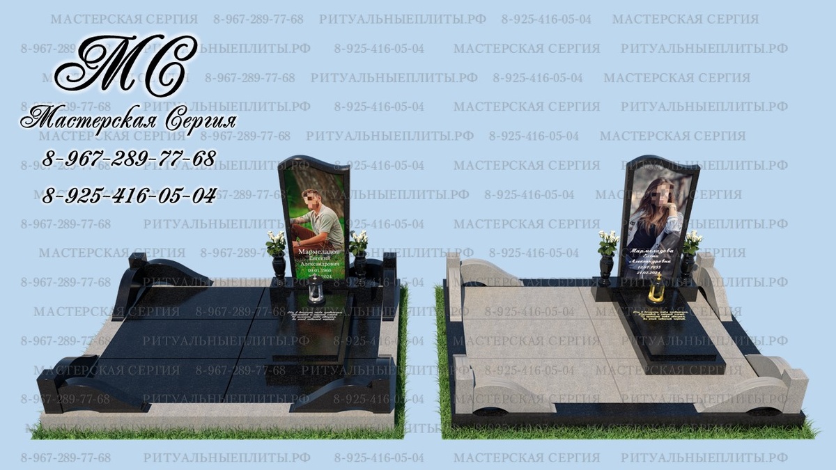Наша компания предлагает премиальные решения в двух вариантах, используя сочетание двух натуральных гранитов — белого и черного. Уникальный контраст создается за счет природного рисунка и полировки до зеркального блеска. Особый акцент придает нестандартный портрет, выполненный во весь памятник на итальянском керамограните. Керамогранит обжигается при высокой температуре, что делает его долговечным. Портрет большого размера становится настоящим произведением искусства на долгие годы. Технология позволяет передавать высокую детализацию изображения родного человека, включая все нюансы. Мы предоставляем предварительную ретушь и редакцию фотографии. Если вы хотите получить электронный макет памятника, присылайте фотографию в мессенджер, и мы сделаем детализированный макет. Подробная информация на нашем канале О гранитных памятниках и их особенностях мы рассказывали на нашем канале. Более подробно ознакомиться с материалом можно по ссылке: Гранитные памятники. Композиция из гранита: прочност