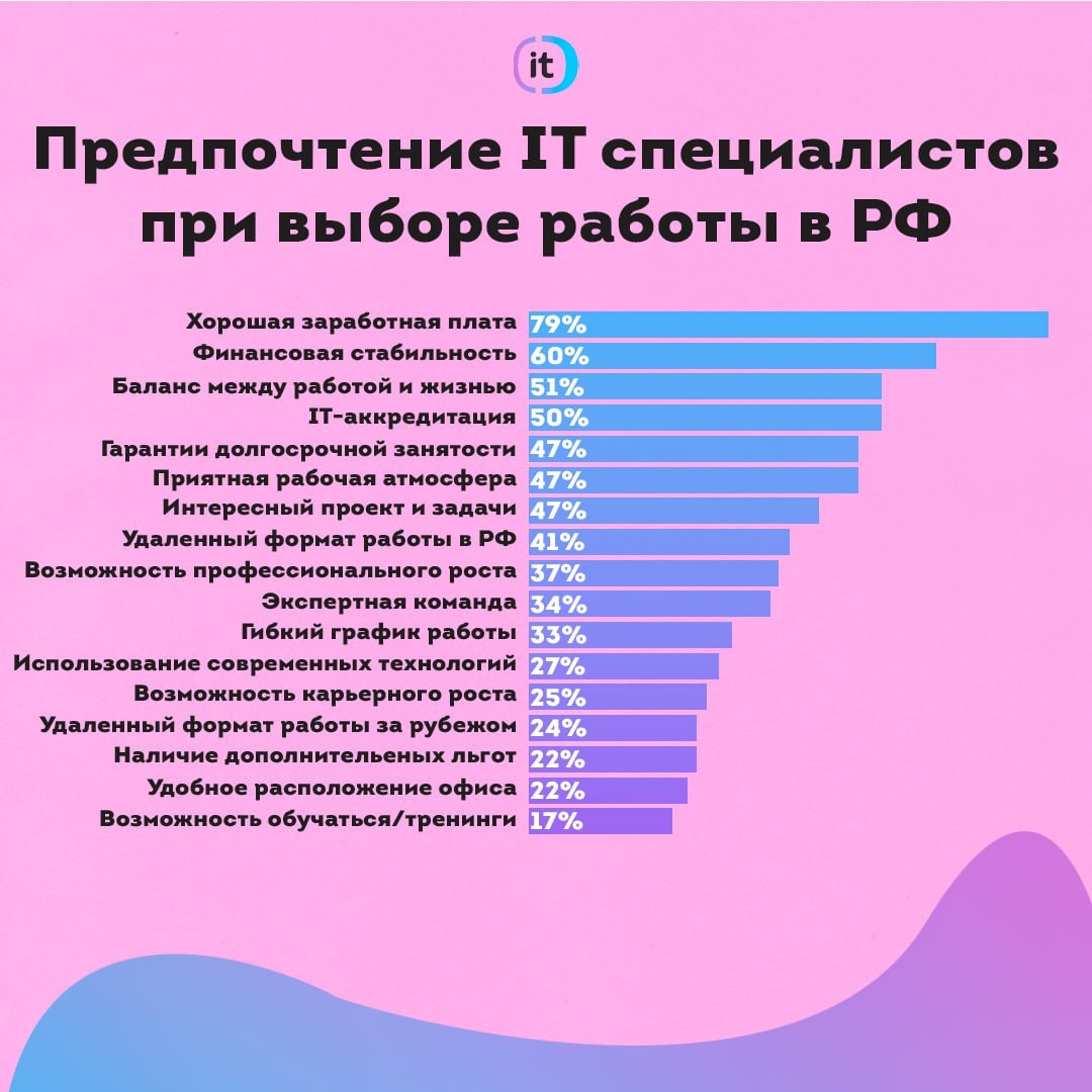 На основе недавних опросов стало понятно, какие факторы играют ключевую роль для IT-специалистов в России при выборе нового места работы. Вот как распределились их приоритеты: 1. Высокая зарплата – ожидаемо, что этот фактор занимает первое место. Конкурентная оплата труда остается основным мотиватором для профессионалов в сфере IT. 2. Финансовая стабильность – безопасность в плане доходов важна для специалистов, особенно в нынешние времена, когда надежность компании выходит на первый план. 3. Баланс между работой и личной жизнью – несмотря на динамичный ритм работы, IT-специалисты ценят возможность сохранять баланс и уделять время себе и семье. 4. ИТ-аккредитация – компании, которые получили аккредитацию в IT-сфере, вызывают больше доверия и привлекают кандидатов. 5. Гарантии долгосрочной занятости – стабильность трудовых отношений и перспективы развития в компании остаются важным аспектом для многих кандидатов. Также немаловажную роль играют: 🔹 Наличие интересных проектов и задач🔹Ги