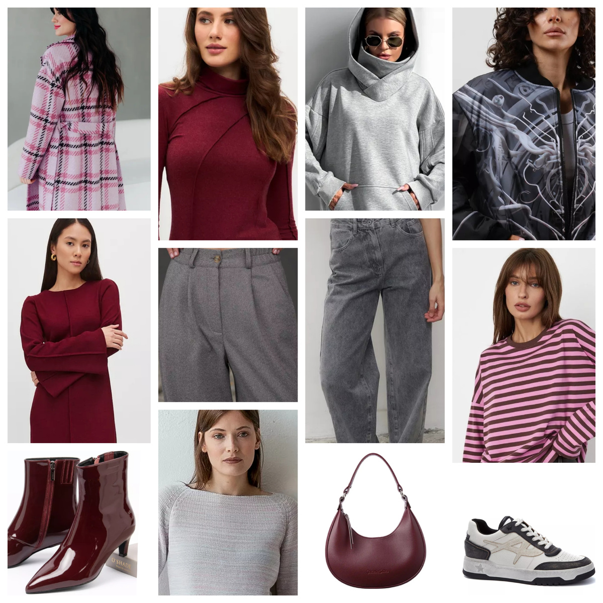 Сочетать! И сочетать правильно. Естественно я скажу сочетать цветом и объединять смыслами. И все получается! Капсула, обратите внимание делится на две части. Думаю не только меня периодически накрывает желанием ходить в девочковом-девочковом. И хочется розовое пальто, яркие сочные ботильоны, на невысоком каблуке, яркую водолазку. Тут будет отступление. Цвет водолазки покорил. Сочный, актуальный, винный или бордовый. Немного меланжевый, от того и более интересный. В общем я влюбилась. Зиму 23 я любила такую синюю, зиму 24 я любила такую серую. А тут капец как надо эту. Мне очень нравится их малиновый, но я почему-то его себе так за два года не купила, брала только на подарок, а тут чую вот мой вариант. Эх, составление капсул ведёт прямой дорогой к покупкам. В общем добавила в корзину. Теперь надо подобрать брюки на осень. А то мои любимые все умотались, пора обновить. Пока зависала на водолазке и дособирала капсулу увидела худи. Зацепила необычная горловина. Я часто поддеваю под худ