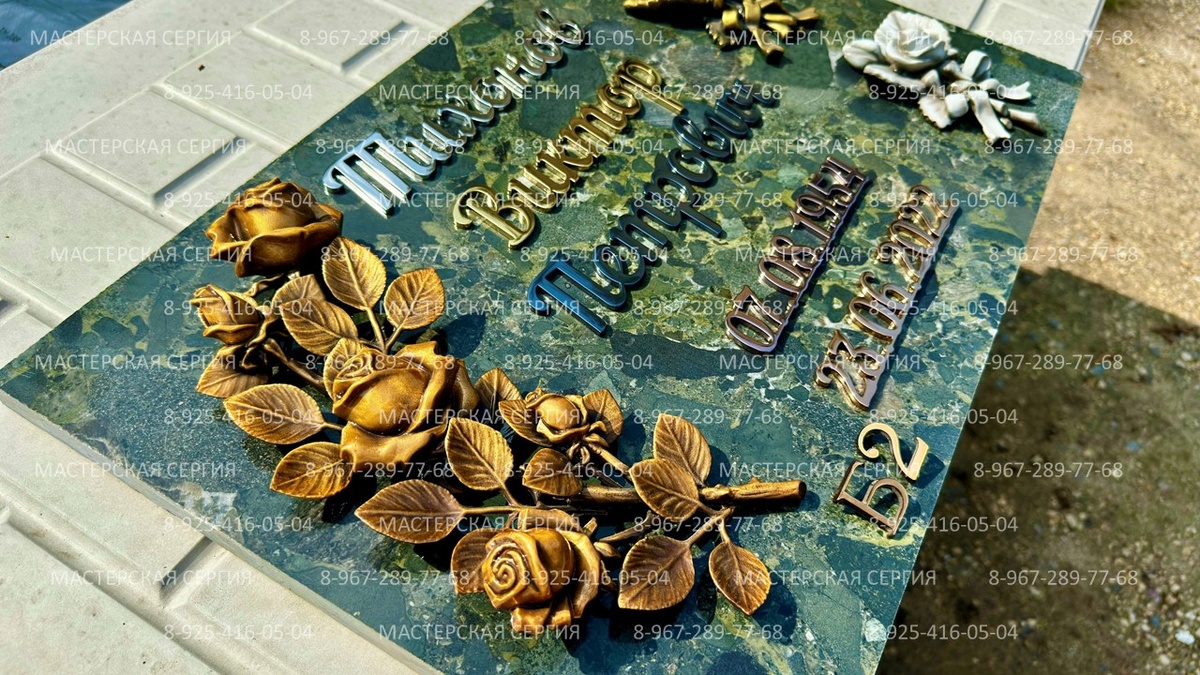 Мастерская Сергия, по многочисленным запросам клиентов, представляет новое решение — накладные буквы на зеленом натуральном камне с различными покрытиями. Темно-зеленый гранит отличается красивым глубоким оттенком, а его уникальный рисунок делает каждый квадратный метр неповторимым. Один участок гранита может значительно отличаться от другого, что добавляет изделию эксклюзивности. Долговечные надписи из нержавеющей стали создают выразительный контраст с природным камнем. Каждая буква отполирована до зеркального блеска и покрыта стойким защитным слоем, что делает их легко читаемыми даже с большого расстояния. Это особенно актуально для людей преклонного возраста. Также буквы можно дополнить накладным цветочным декором или другими элементами оформления. Для надписи можно выбрать любой шрифт, который подойдет для мемориала. Мы предоставляем предварительный электронный макет памятника и оформления. На макете вы сможете увидеть, как будут сочетаться буквы из нержавейки с памятником, крестом