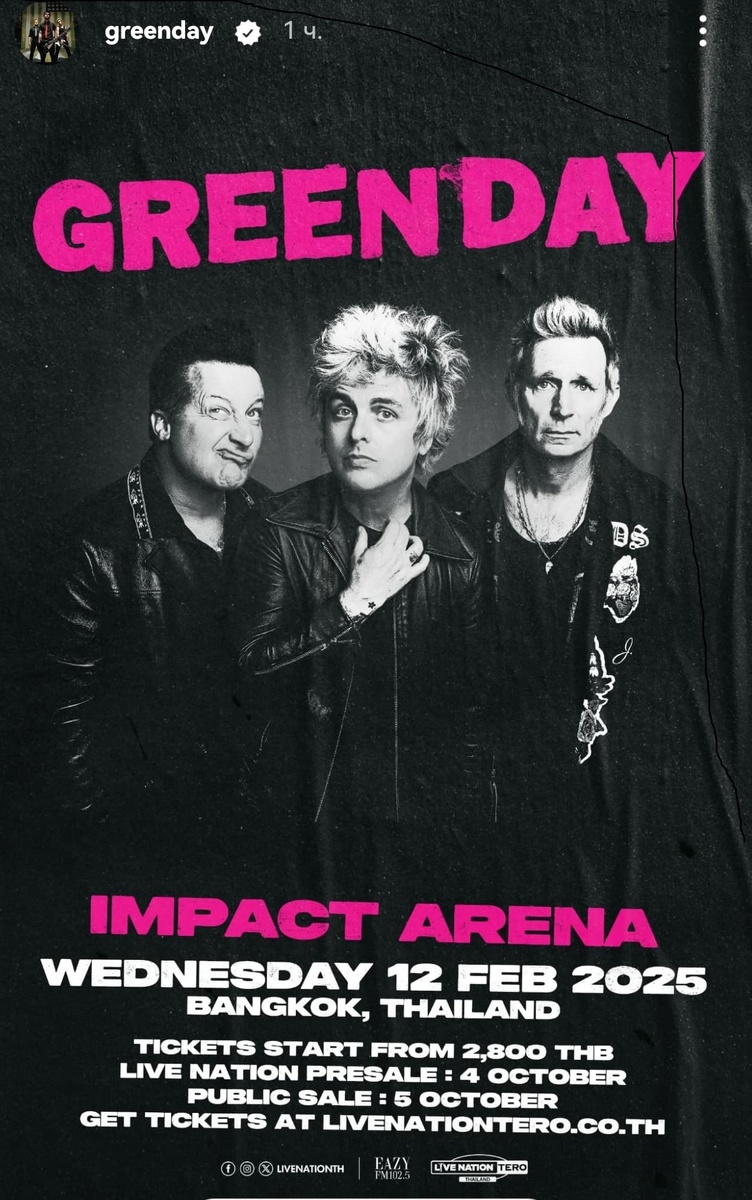 Green Day - Bangkok - 12 February 2025 Билеты появятся с 1 октября 2024. Как в той песне поётся - "Wake me up when September ends" Цены на билеты от 2800 до 6800 бат. Стоячий партер от 5500. Схема зала и цены билетов на картинке ниже, листай. Я, конечно, надеюсь пойти. Жаль, что не смогу купить билеты в октябре, ибо у меня каникулы, и это большие траты… И партер, думаю, разберут. Те, кто проснутся к началу октября. Если собираешься на Green Day в Бангкоке, напиши плиз. А ещё в Таиланде выступят Cigarettes After Sex, обожаю. Их концерт в Бангкоке 21 января 2025. Хотелось бы, но под сомнением. Я живу не в Бангкоке, а в провинции, и работаю здесь, потому так часто на концерты не поездишь. Также, в Таиланде будут Imagine Dragons 23 ноября 2024. Все билеты проданы.