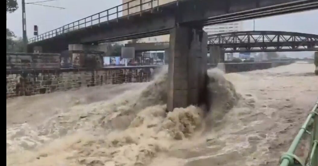 На кадрах, снятых в воскресенье, бурлящая река потоками захлестывает основание моста и мощным течением несется вдоль железнодорожных путей.