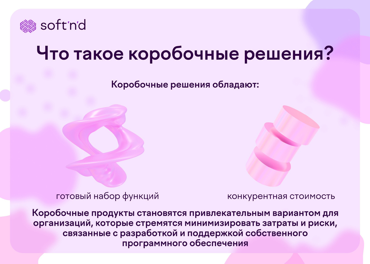 Что такое коробочные решения? Коробочные решения представляют собой стандартизированные программные или аппаратные продукты, которые разрабатываются и продаются для широкого спектра пользователей. Эти решения часто являются результатом многолетних исследований, разработки и тестирования, и они предназначены для удовлетворения определенных потребностей или решения типичных задач в различных отраслях. В отличие от кастомизированных или индивидуальных решений, коробочные продукты обладают готовым набором функций и настроек, которые могут быстро адаптироваться и внедряться пользователями с минимальными изменениями. Кроме того, коробочные решения часто обладают одной из самых конкурентных стоимостей, что делает их доступными для широкого круга пользователей. Производители таких продуктов также предоставляют регулярные обновления и поддержку, что обеспечивает долгосрочную актуальность и безопасность решений. В результате, коробочные продукты становятся привлекательным вариантом для организац