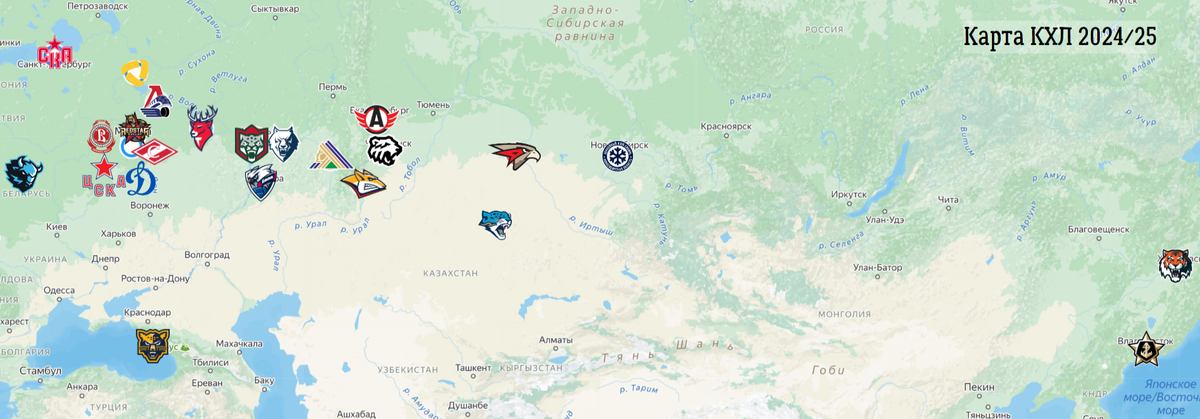Все профессиональные клубы на карте России В сезоне 2024/25 в России функционируют пять профессиональных хоккейных лиг: Континентальная, Всероссийская, Молодежная, Национальная молодежная и Женская. Всего в них выступает 122 команды из России (было 116), по две из Беларуси и Казахстана, еще один клуб представляет Китай. Континентальная хоккейная лига: 23 команды Впервые в истории в межсезонье не изменился состав участников КХЛ. 23 команды разделены на две конференции, в плей-офф Кубка Гагарина выйдут по 8 лучших клубов из каждой конференции. Самый восточный клуб — хабаровский «Амур», самый западный — минское «Динамо». Действующий чемпион — магнитогорский «Металлург». Всероссийская хоккейная лига: 33 команды Сибирская часть ВХЛ В ВХЛ летом вошли «Олимпия» из Кирово-Чепецка, «Магнитка» из Магнитогорска, московский «Юнисон» и «Торпедо-Горький» из Нижнего Новгорода. Поволжье и Урал В ВХЛ представлен 31 город России, по две команды выступают из Санкт-Петербурга и Москвы. Центральная часть Р