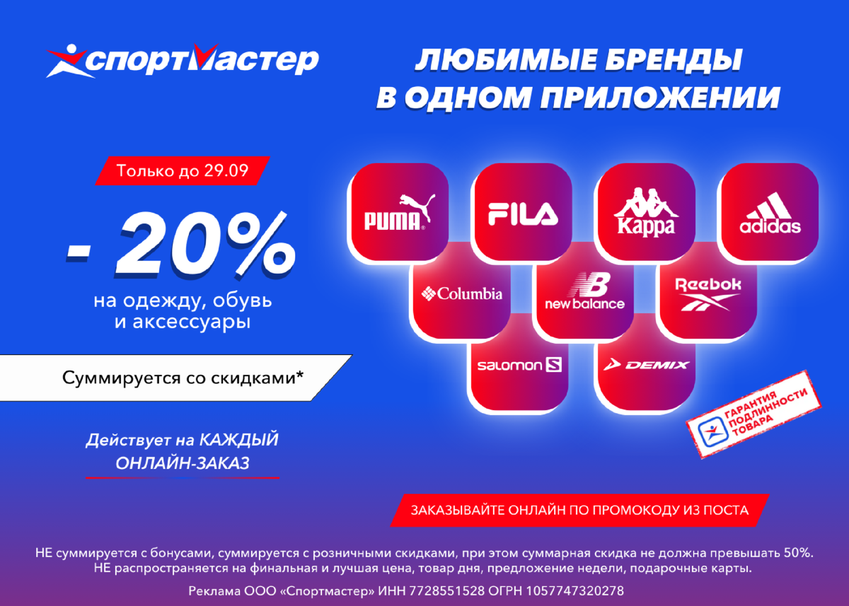 С 16 по 30 сентября при заказе через приложение Спортмастер можно получить скидку 20% на любые товары: одежда, обувь, аксессуары и все остальное в ассортименте магазина. Для этого нужно в приложении Спортмастер положить в корзину хотя бы один товар и перед оплатой применить промокод СМПР6640. Скидка суммируется с текущими скидками магазина, суммарная скидка не должна превышать 50%. 🏆 В Спортмастере большой ассортимент одежды и обуви известных брендов: New Balance, Adidas, Reebok, Columbia, Salomon, Puma, Fila и других. ❗️ Промокод не суммируется с бонусами и не распространяется на категории: «Лучшая цена», «Предложение недели», «Финальная цена», «Товар дня» и подарочные карты Спортмастера. Информацию о самых выгодных акциях банков, супермаркетов, сервисов доставки, АЗС и сервисов для путешествий я регулярно выкладываю в своем Телеграм-канале. Подписывайтесь и экономьте свои деньги! Читайте также другие мои статьи: