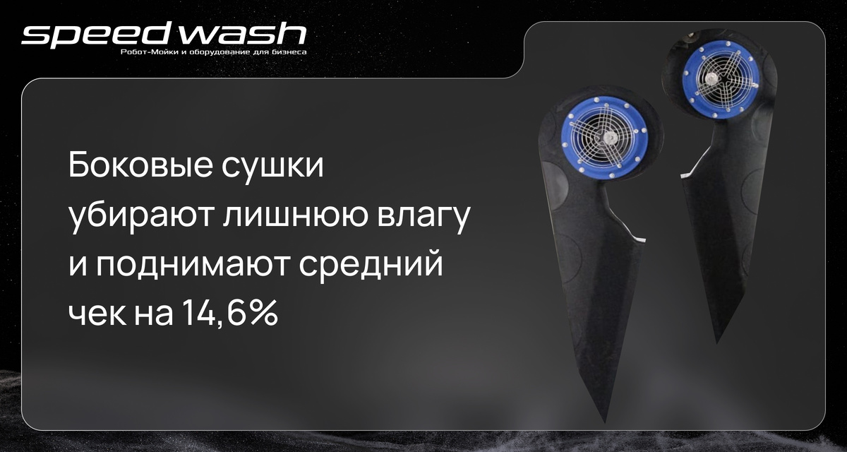Боковые сушки поднимают средний чек на 14,6%! На робот-мойку можно поставить дополнительное оборудование, которое улучшает качество мойки, поднимает стоимость одного цикла, увеличивает срок службы оборудования. Одно из них – боковые сушки, которые удаляют влагу из труднодоступных мест: с кузова, дверей и крыльев автомобиля. Это оборудование приносит на 14,6% больше прибыли с каждого цикла мойки, где использовалась эта услуга! Дополнительные боковые сушки на робот-мойке – это инновационное решение, которое позволяет быстро и эффективно удалять влагу с кузова, дверей и крыльев автомобиля, а также с труднодоступных мест. Как это работает? Боковые сушки размещены слева и справа от автомобиля, находящегося в боксе робот-мойки. После завершения основного цикла сушки, срабатывают дополнительные датчики. Поток воздуха, направленный от передней к задней части автомобиля, сдувает капли воды из труднодоступных мест. Боковые сушки не только привлекут больше клиентов, но и поднимут средний чек на
