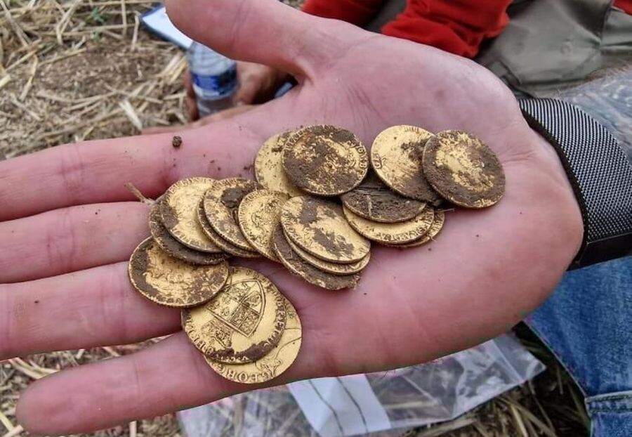 Такие деньги чеканили с 1771 по 1794 годы, во время правления короля Георга III. Называются они гинеи. Восемь монет были в одной ямке, остальные — в разбросе поблизости. Найти их посчастливилось Брайану Мерфи, который прибыл со своим Minelab Equinox 900 из Ирландии. Он признался, что когда выкопал первые монеты, его буквально затрясло, как в панике. Был очень сильный всплеск адреналина.
