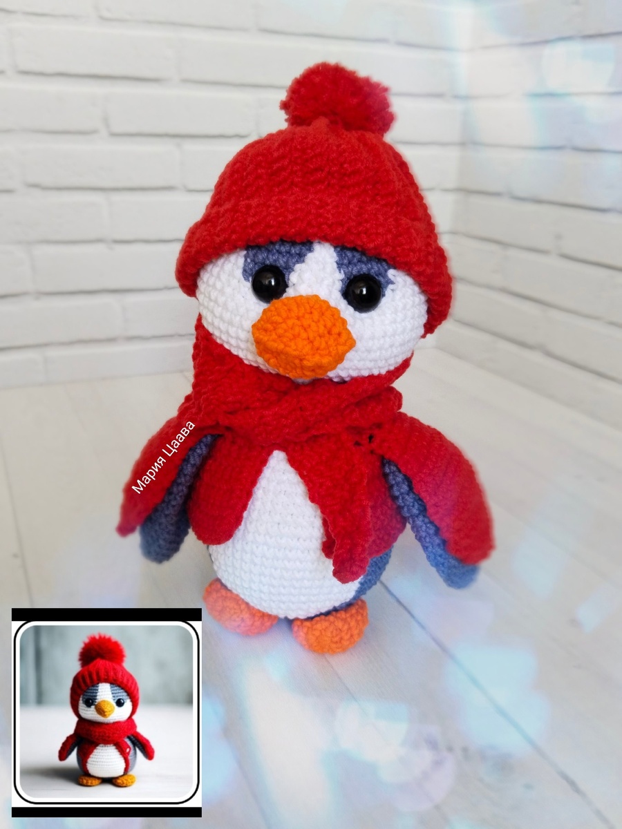 В этот раз в челленже опять две работы Марии Цаава канал Уголок рукоделия Вязание крючком И моя работа Считаю что обе очень похожи на свои прототипы. Про свою расскажу подробнее. Это удивительно, но связался пингвин с первого раза, я не распускала ни одной детали. Начала, свою работу я с похода в магазин и покупки материалов. Мой выбор пал на Троицкую пряжу "Кроха". Именно тут были все интересующие меня цвета. Вязание игрушки я начала с крылышек. Подумала так что от из размера построю всю остальную пропорцию. Затем, я приступила к вязанию тела. Крылья решила ввязать по ходу вязания. Следующим этапом стало создание головы. Относительно картинки от нейросети глаза у моего пингвина большеваты. Я поставила 14мм, а надо было 12. Но 12мм у меня нет и я все время забываю заказать. Потом, встал вопрос создания клюва. То что было на картинке нейросети меня не устраивало. Так как клюв совсем не похож на пингвиний. Я решила поступиться схожестью и связать свой, такой как у пингвина на мой