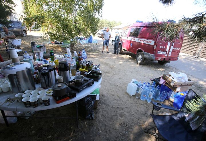 До первых домов «Дона» пламя не дошло метров 200 — 300, хотя именно в этом месте огонь прошёлся и по деревьям. На улице Янтарной располагается штаб пожаротушения, тут же — волонтёры, человек 15 — 20. Вот уже двое суток они кормят и поят огнеборцев.